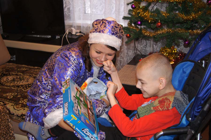 Добровольцы, переодевшись в Деда Мороза и Снегурочку, посетили на дому особых ребятишек и их братьев и сестер. Для каждого из них они разыграли новогодние сценки, поговорили с мальчишками и девчонками, послушали, что нового они узнали за год.