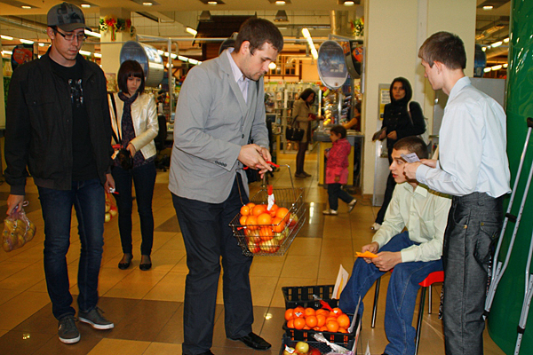 Для того, чтобы стать участником акции надо было приобрести минимум один любой фрукт и положить его в специально отведенные ящики.
