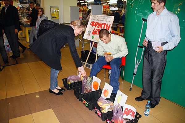 Мы были приятно удивлены, тем, что в городе столько много отзывчивых людей. Началось все с администрации ТРК Континент, которые любезно предоставили нам место для проведения акции. Затем к нам присоединились наши друзья: воспитанник центра «Дар» Карпушкин Антон, и выпускник школы-интерната № 88 Кузьминов Иван. Организацией акции занимались активисты Проекта «Общественное участие» - рисовали плакаты, печатали листовки, искали ящики для фруктов, распространяли информацию, обеспечивали автотранспортную поддержку. И вот час «Х». В торговом центре суета, пятничный праздничный вечер, выпускники школ празднуют свой последний звонок, горожане возвращаются домой после трудового дня. Первыми положили фрукты организаторы акции, затем к ним присоединились пользователи социальных сетей, где было размещено объявление. Увидев ажиотаж, возле нашей небольшой группки, многие посетители Континента начали интересоваться, кто-то услышал речевки, звучавшие на всем первом этаже торгового центра, кто-то пришел с улицы, неся в руках листовку. Люди выходили со своими покупками, и, узнав про акцию, возвращались специально, чтобы купить фрукты. Практически никто не положил один фрукт - все несли витамины килограммами. Первый ящик с яблоками был собран за 12 минут с начала акции. Практически все горожане, которые посетили в этот заветный час ТРК Континент, оставили частичку своей доброты и тепла для детишек.